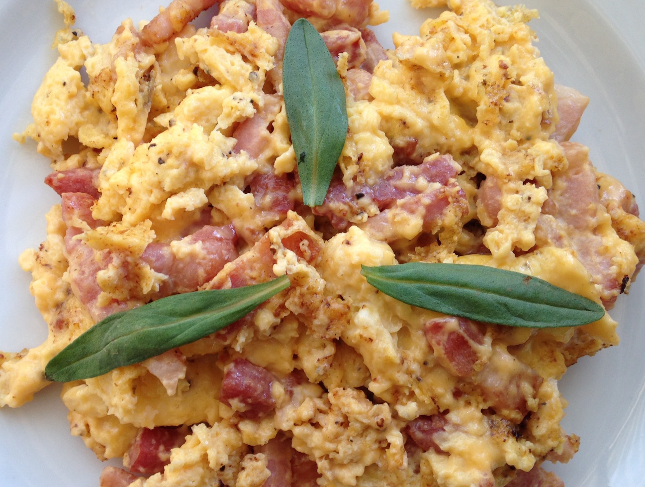 In the pan, I fried the pancetta until the fat rendered. I poured the eggs and cheese over the meat and waited until it had just set before haphazardly flipping over large pieces at a time. I plated the chunky scrambled eggs and dove in.