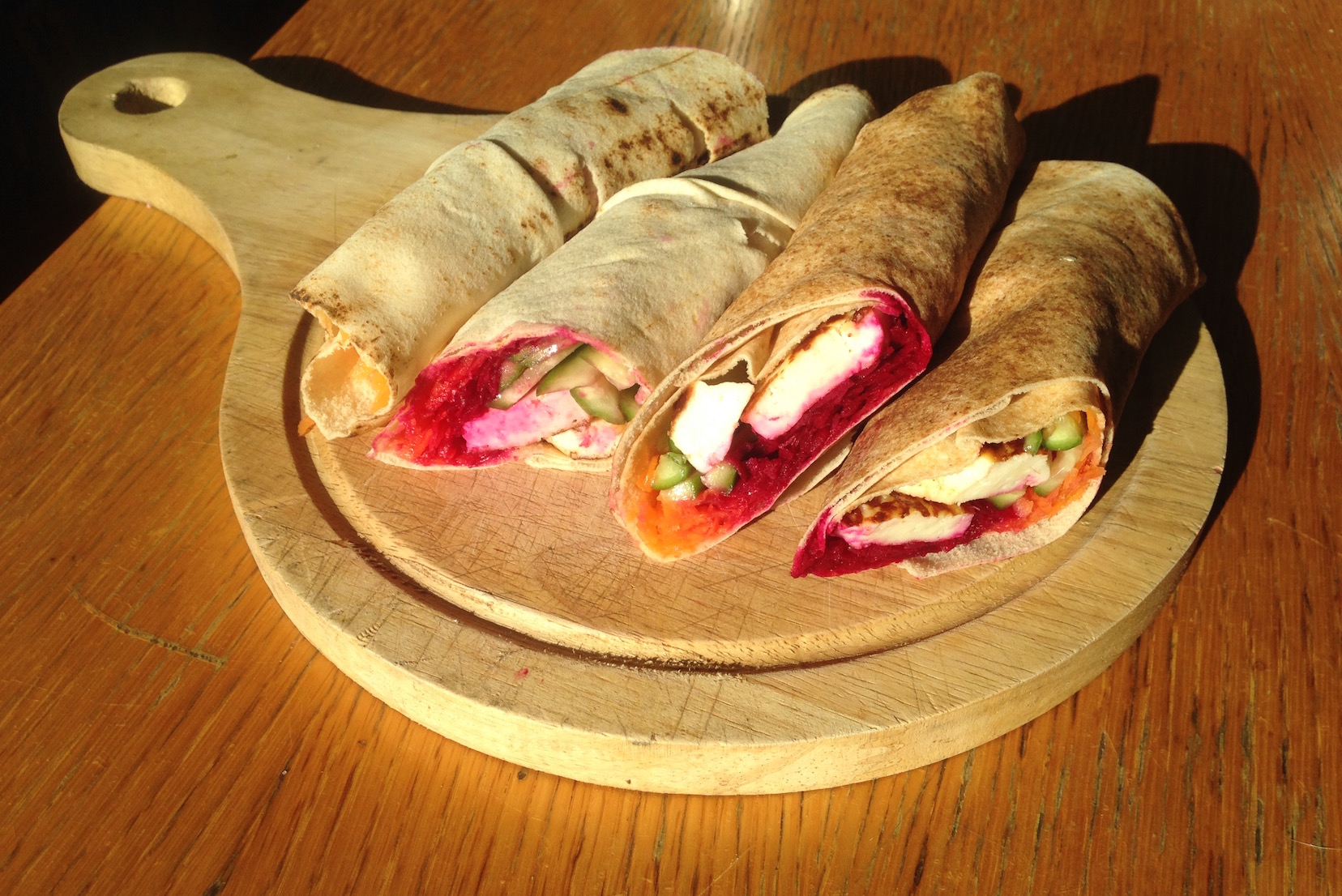 A more traditional Lebanese halloumi sandwich will have tomatoes and cucumbers (and maybe olives and mint) in lieu of the cucumbers beets and carrots I use here. Both are nice, but I personally prefer the sweet freshness of this vegetable triad.